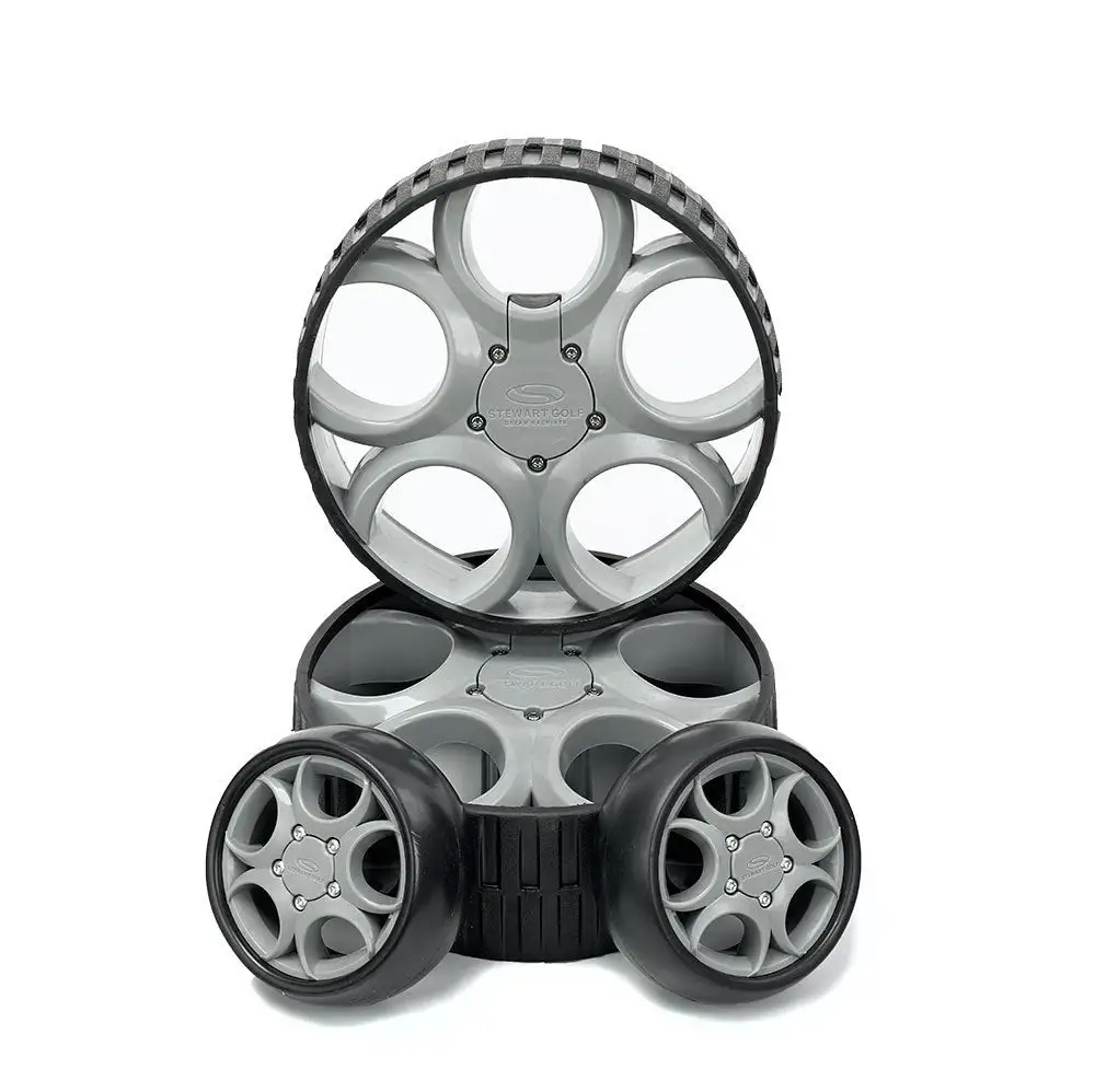 Stewart Golf engineers worked in conjunction with specialist manufacturer Hedgehog to create a set of 4 wheels that would both reduce the weight and further improve the performance of both the Q Series, X Series and F1 Lithium trolleys.